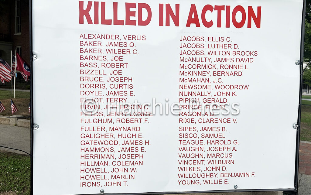 There are 44 names of soldiers listed on the Killed in Action board. The question has often been asked as why only those names are listed when Hardeman County has a large representation of veterans who fought and soldiers who died while serving.