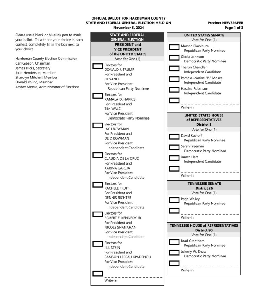 All Hardeman County voters will have the opportunity to choose between seven (7) candidates for President of the United States;
