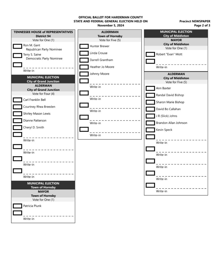 Early voting for the State and Federal General Election, and Towns of Grand Junction, Hornsby, Middleton, Saulsbury, Silerton, and Toone Municipal Elections begins Wednesday, October 16, 2024, and runs through Thursday, October 31, 2024, at the Hardeman County Election Commission office, 227 Lucy Black Road, in Bolivar. Early voting hours are Monday through Friday, 9 a.m. to 4 p.m. and Saturday 9 a.m. to 12 p.m.