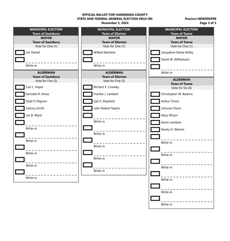 Voters in the Town of Saulsbury will be electing a new mayor and new alderman. Only one candidate qualified for the mayors race, Jim Daniel. Voters will be asked to choose five aldermen from the five candidates that qualified. The choices are Carl L. Hayes, Kenneth R. Hines, Todd O Pegram, Johnny Smith, and Jan B. Ward.
