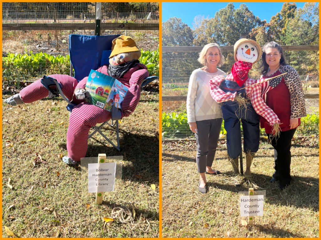 Bolivar Hardeman County Library scarecrow and Hardeman County Trustee scarecrow