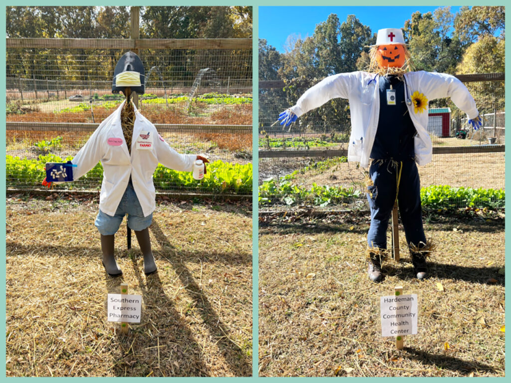 Southern Express Pharmacy scarecrow and Hardeman County Community Health Center scarecrow.