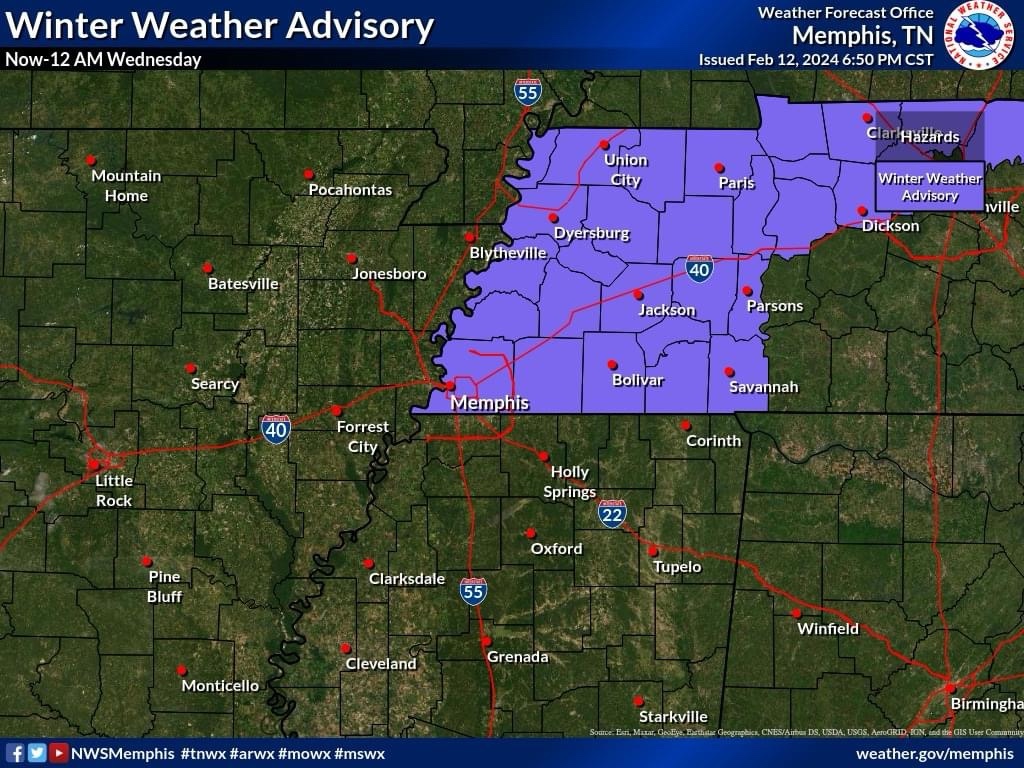 The National Weather Service has issued a Winter Weather Advisory for Monday, February 12, 2024, from 5pm until midnight.